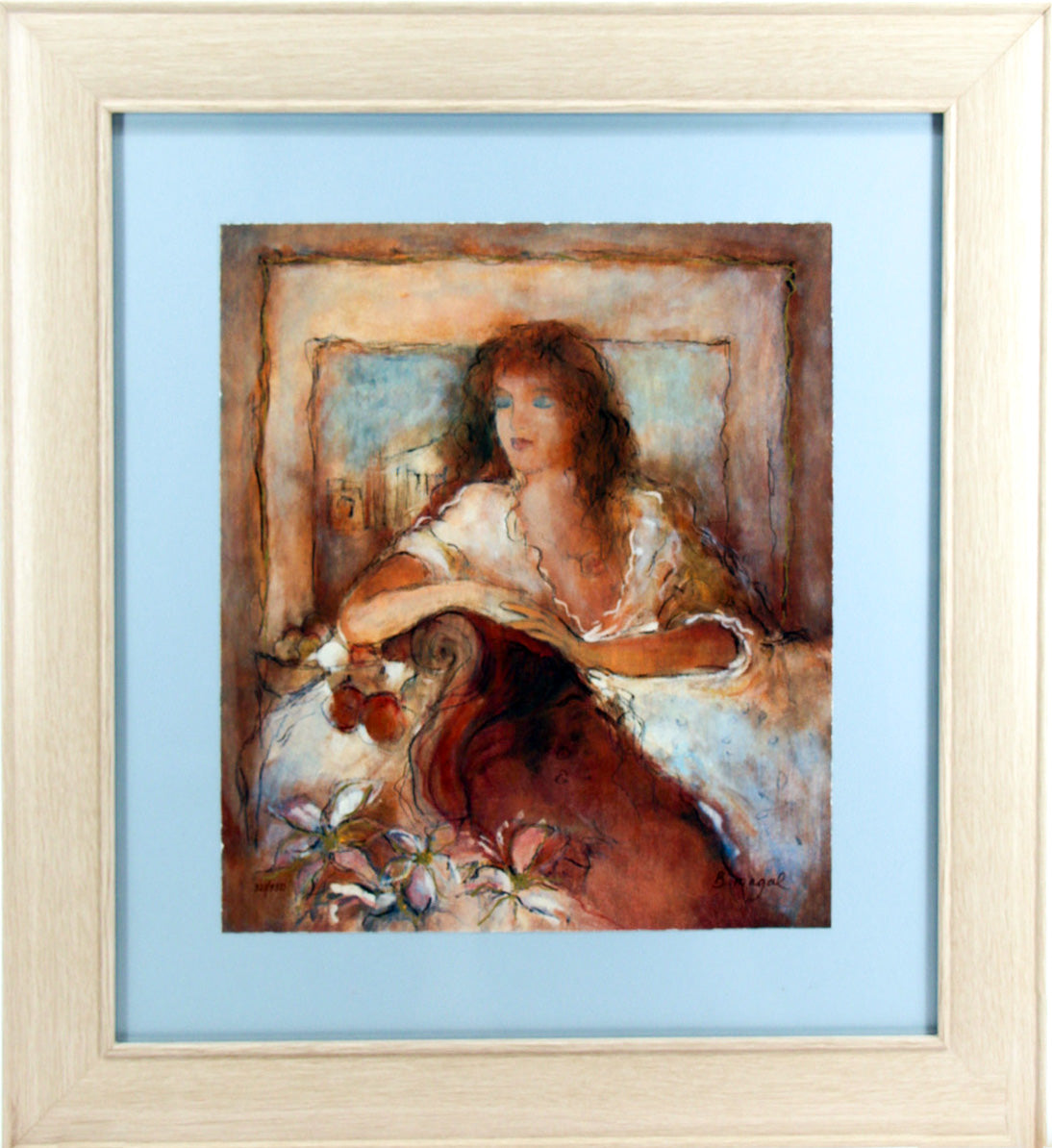 Batia Magal’s art is ever-evolving, marked by a deeply personal and feminine touch. Her simple calligraphic drawings of female forms and flower-filled vases are the foundation of her unique style, enhanced by brilliant washes of lively colors reminiscent of medieval stained-glass windows. Recently, Magal has incorporated fabric textures and prints into her work, creating collages that blend drawing, print, and fabric to achieve a balanced structural composition. Born in Israel in 1953, she showed remarkable talent from a young age and studied at the ‘Avni Art Institute,’ where she was influenced by renowned artists like Streichman and Wexler.