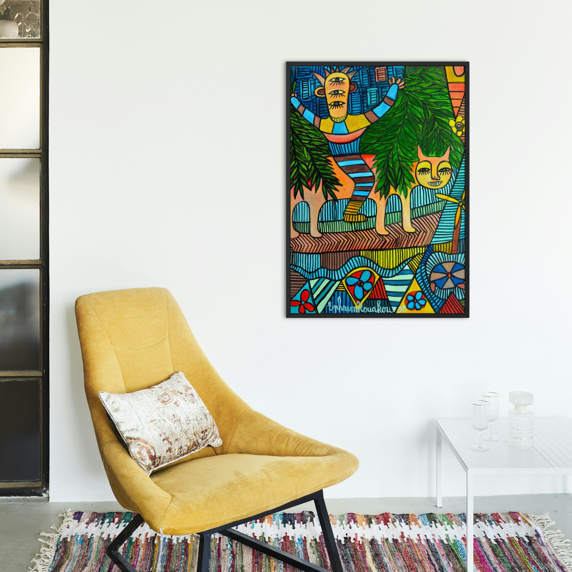 Ephrem Kouakou, a leading African painter residing in Baltimore, Maryland, and Ivory Coast, merges indigenous African aesthetics with Western techniques. His vivid works grace esteemed collections, including The Metropolitan Museum and the Smithsonian National Museum of African Art. Born in 1962 in the Ivory Coast, Kouakou, a Baoule group member, trained as a medicine man, infusing deep spirituality into his art. Themes of community, masks, protective spirits, and animal guides reflect an unseen world. At 17, he journeyed 2500 miles from Ivory Coast to Algeria before studying at top French art academies. Exhibited globally, his highly saturated works, blending raw pigments, are represented by Still Life Gallery.