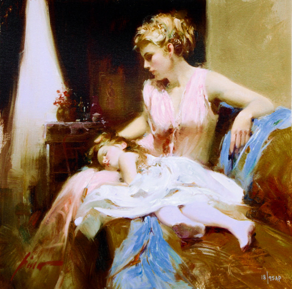 Giuseppe Dangelico Pino was an Italian artist renowned for his romantic figurative paintings. His work often depicted elegant women and intimate scenes, characterized by soft brushstrokes, warm colors, and a timeless, classical style that evokes emotion and beauty.