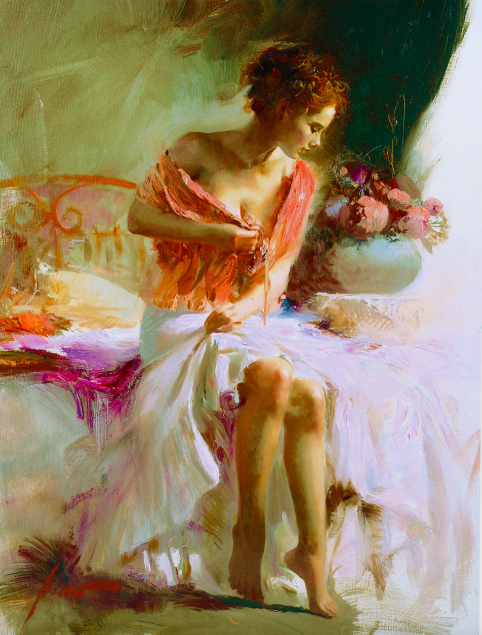 Giuseppe Dangelico Pino was an Italian artist renowned for his romantic figurative paintings. His work often depicted elegant women and intimate scenes, characterized by soft brushstrokes, warm colors, and a timeless, classical style that evokes emotion and beauty.
